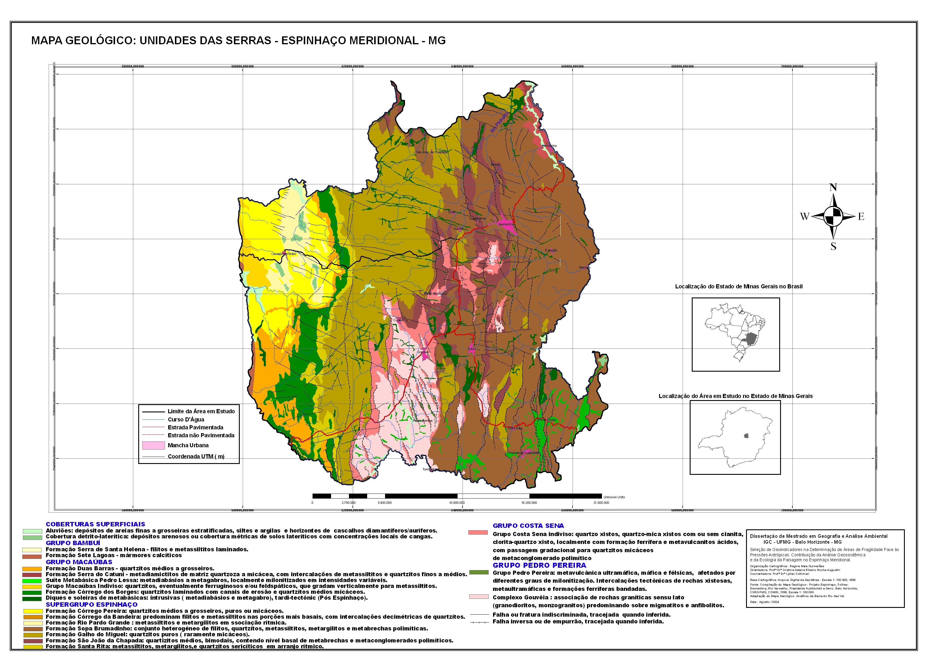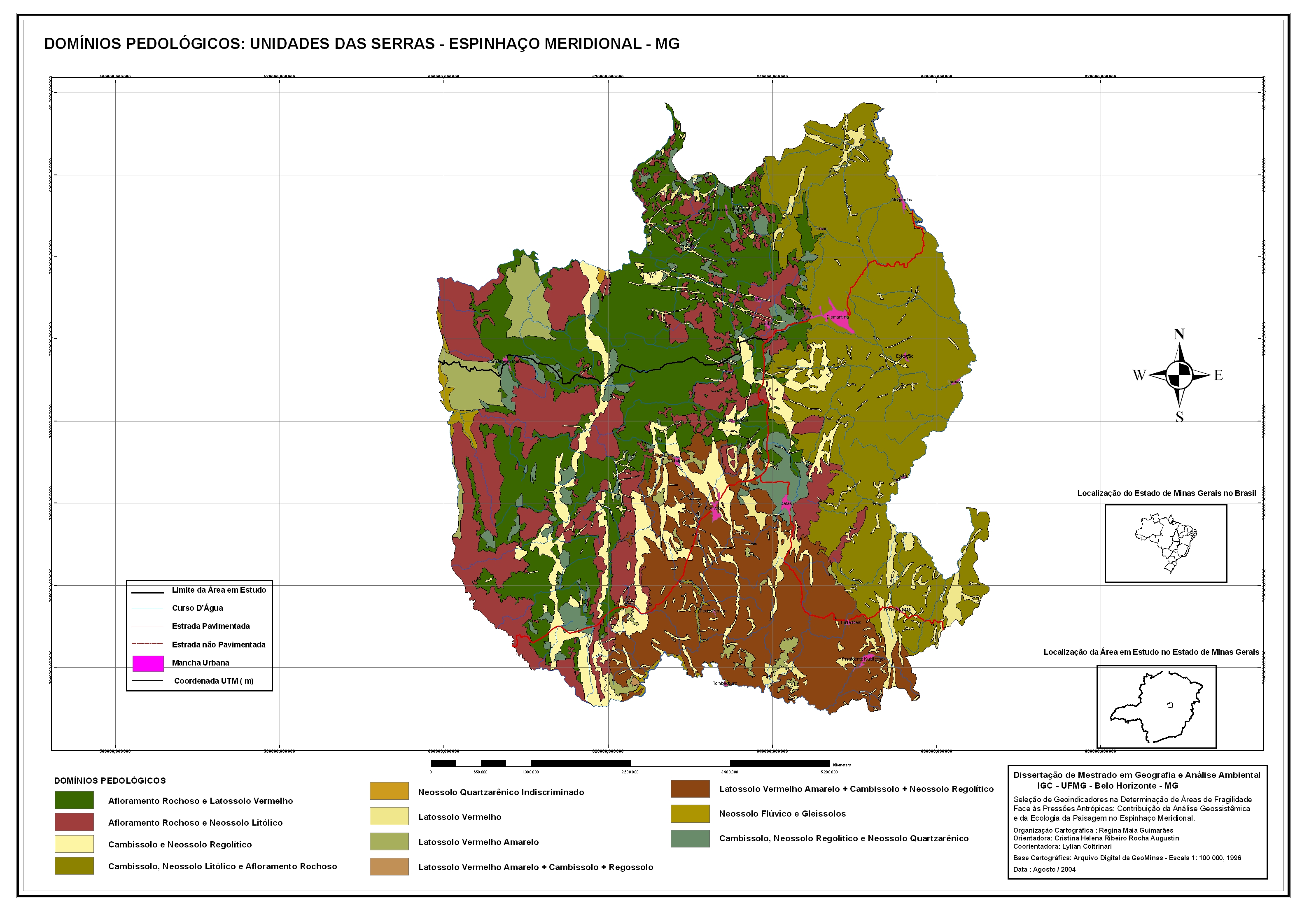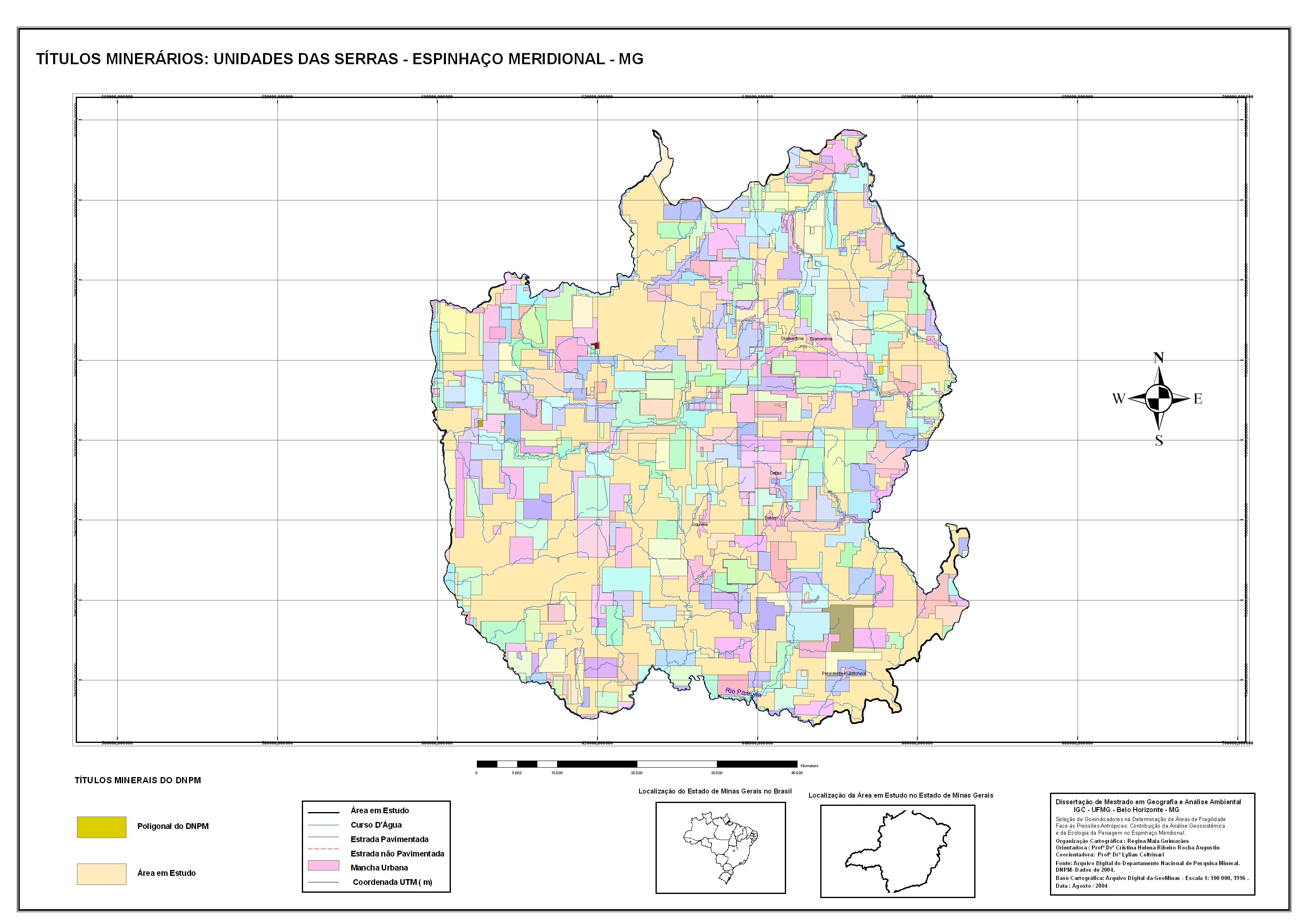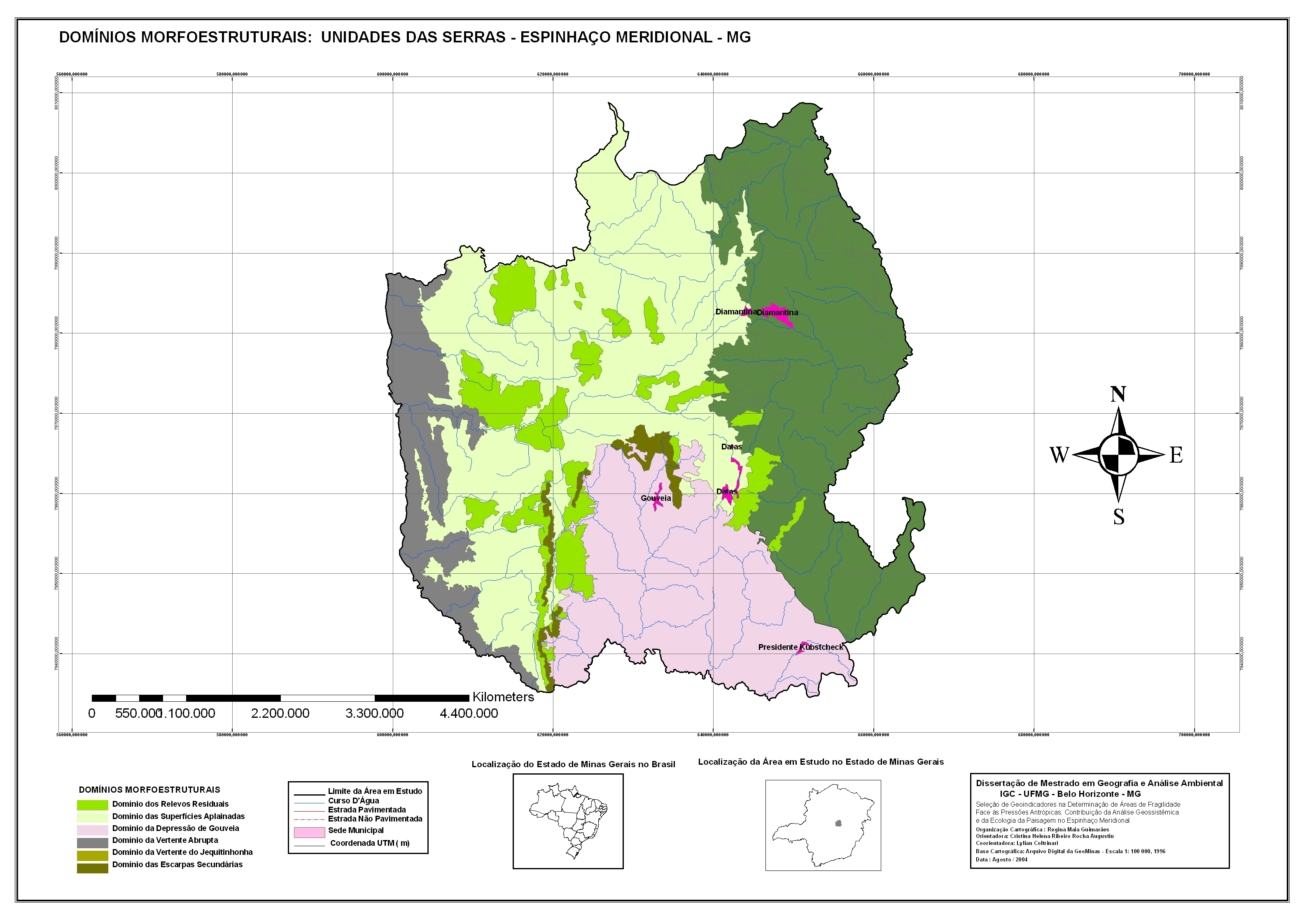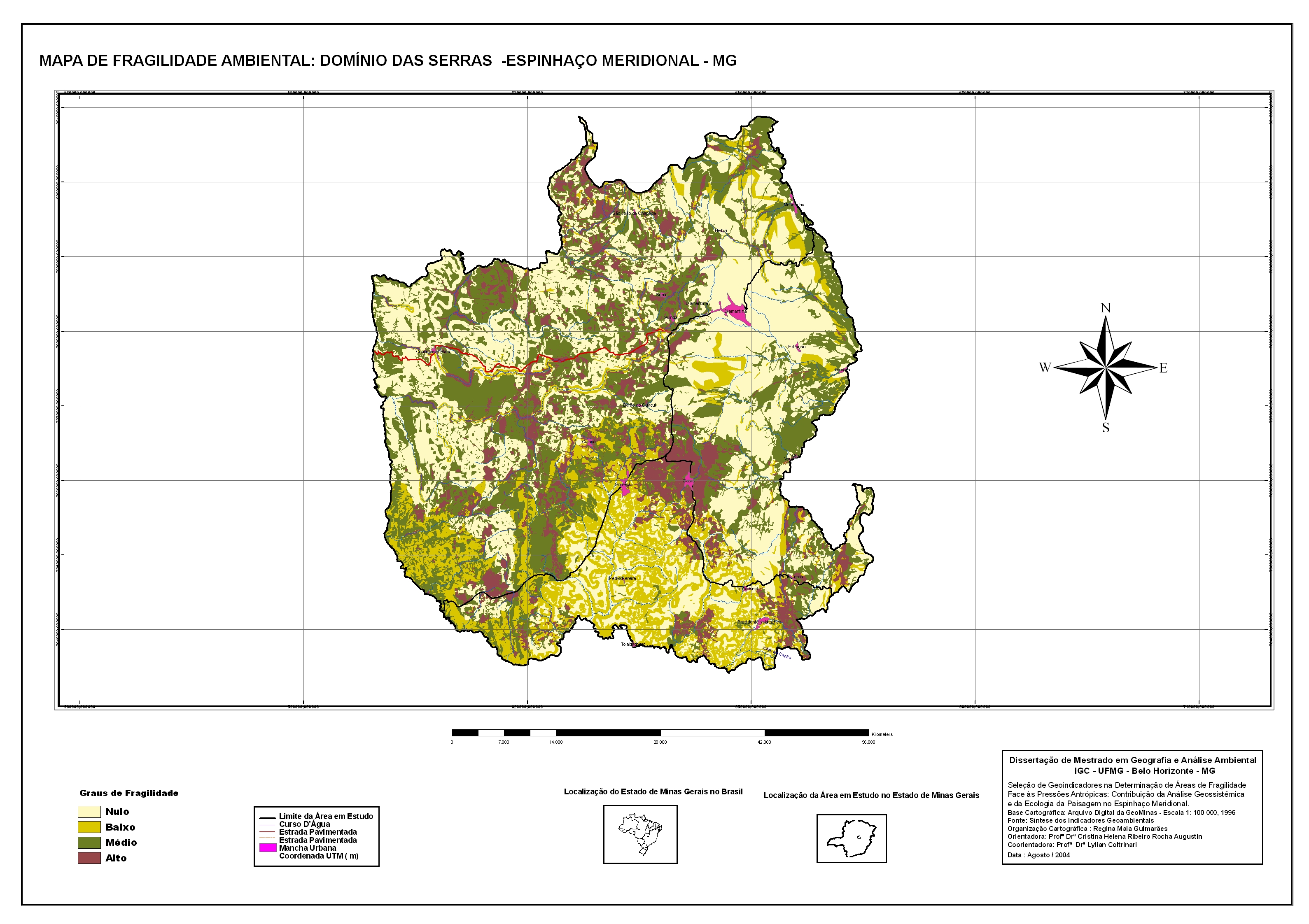 Trata-se da seleção de geoindicadores para definição de áreas de fragilidade ambiental na região da Serra do Espinhaço, abrangendo 3 500 Km2 de seu setor meridional, tendo como principais núcleos urbanos as cidades de Diamantina, Datas, Gouveia e Presidente Kubitschek.A abordagem metodológica adotada nesse estudo constou da integração dos elementos bióticos, abióticos e econômicos, norteados pelas teorias dos Geossistemas e da Ecologia da Paisagem. A análise resultou na seleção de nove geoindicadores, espacialmente expressos por meio da técnica de geoprocessamento, que permitiram a identificação de áreas com baixo, médio e alto graus de fragilidade, em relação às pressões antropogênicas exercidas pelas atividades econômicas vocacionais da região.Dentro da perspectiva analítica da paisagem, incorporou-se o componente econômico traduzido pelo ensaio sobre as práticas de valoração econômica dos componentes ambientais em relação às atividades antrópicas relevantes.Resulta dessa dissertação uma coletânea de nove mapas temáticos que subsidiaram a análise para elaboração do mapa final das áreas de fragilidade ambiental, bem como um plano de ações, voltado para o uso racional dos recursos ambientais inseridos nas áreas identificadas.Espera-se que essa dissertação possa servir de parâmetro para a gestão ambiental da região em foco e para apoio à comunidade científica envolvida com pesquisas aplicáveis à conservação ambiental.